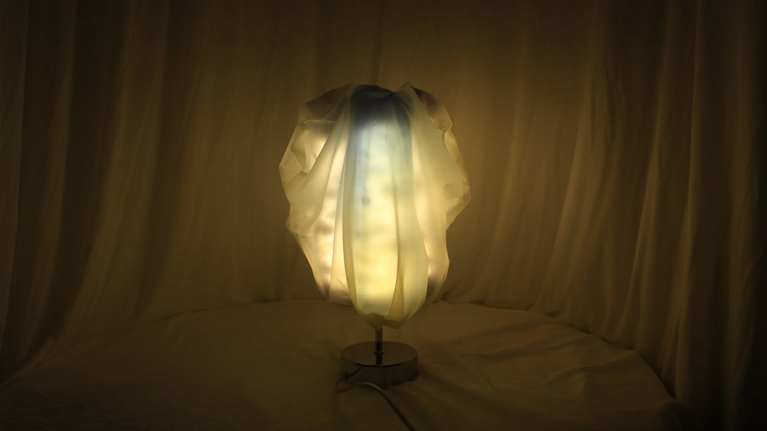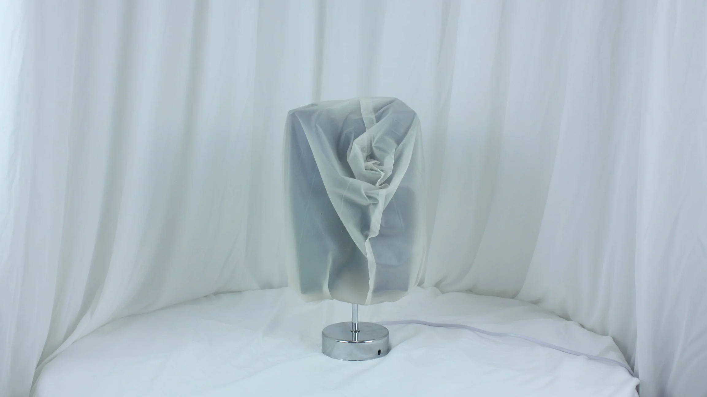 Encasing this structure is an extremely soft, semi-transparent white membrane. Where the membrane comes into contact with the rigid core, it is gently lifted, allowing glimpses of the blue structure beneath. These moments of contact are not precisely controlled but emerge naturally through material behavior, introducing a subtle tension to the overall form.