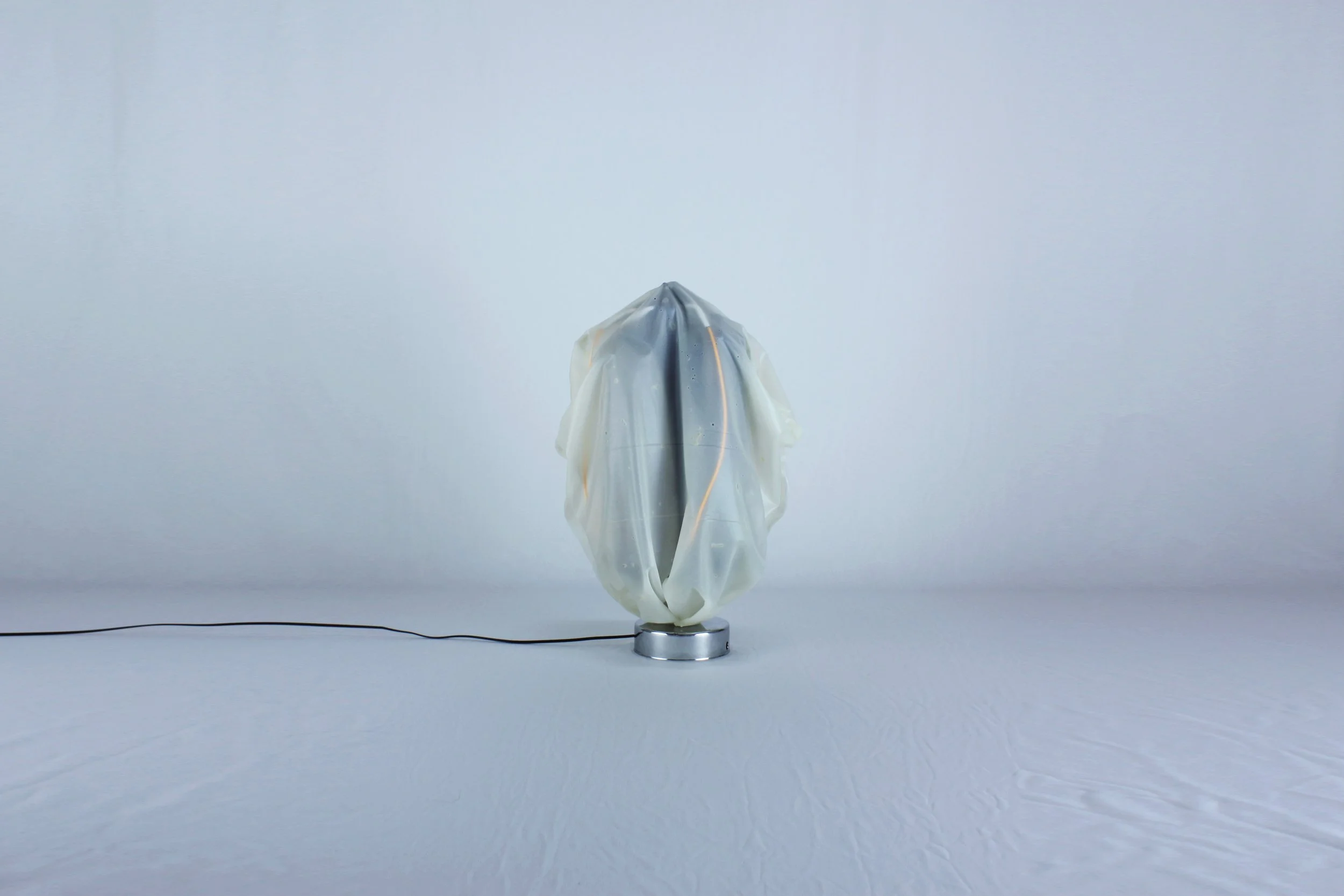 When unlit, the piece shifts toward a sculptural presence. The internal structure becomes more legible: a central blue column wrapped and softened by a translucent white membrane. Without illumination, the object appears still and contained, like a body at rest.