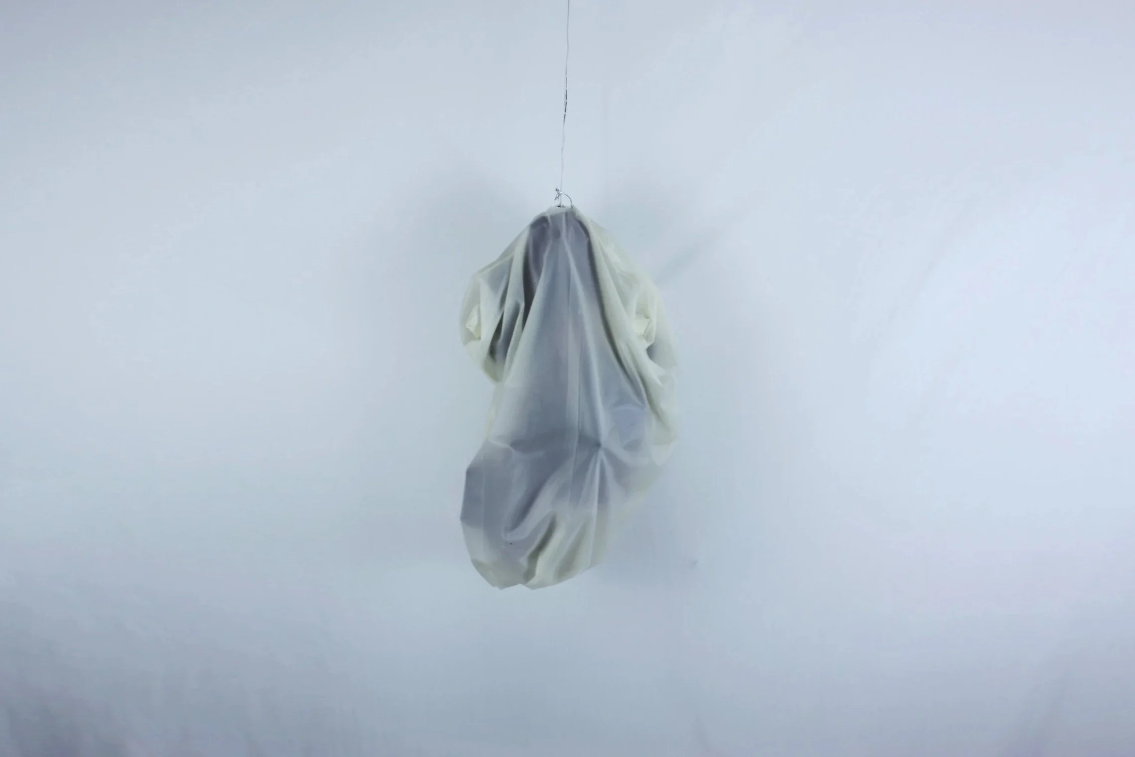 When unlit, the structure becomes more introspective. The spiraling blue core is faintly visible beneath the translucent membrane, around which the outer skin gathers and folds. The form feels enclosed, almost sealed, as if holding something fragile inside.