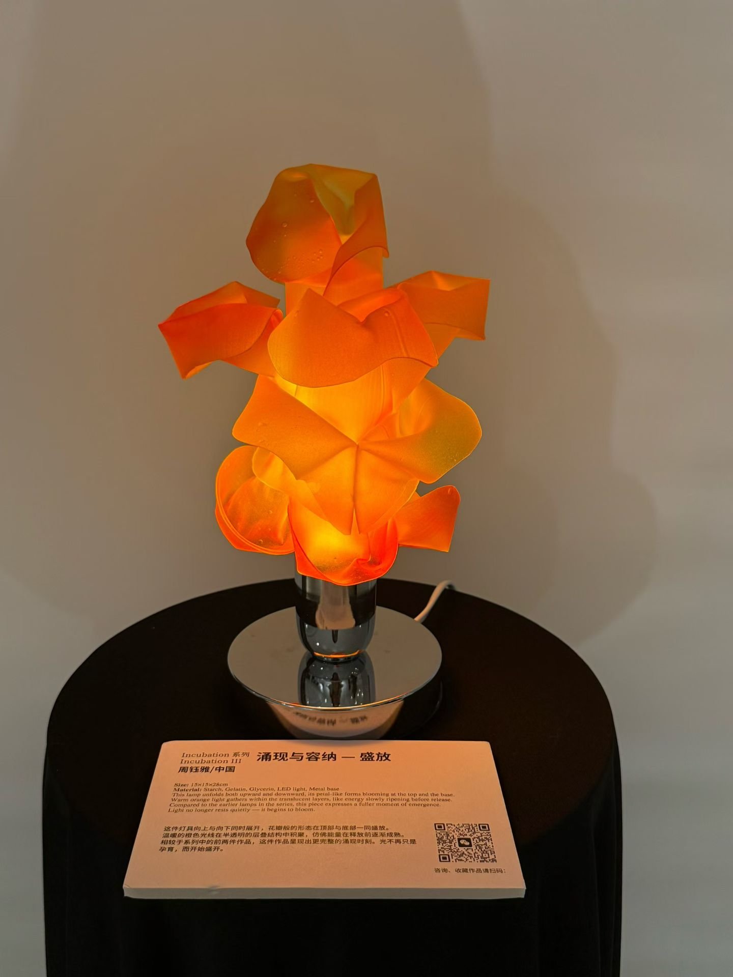 Within this context, I presented a selection of eight light-based works in bio-plastic, spanning the Peripheral, Chromatic, and Incubation series.